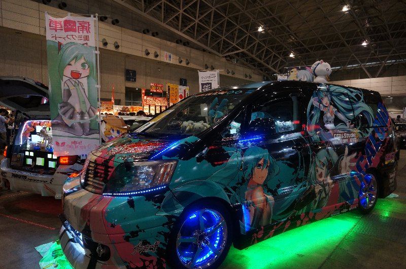 無料ゾーンには「痛車」の展示コーナー。企業ブースもニコニコ動画来場者をターゲットにしているだけに楽しめるものが多かった