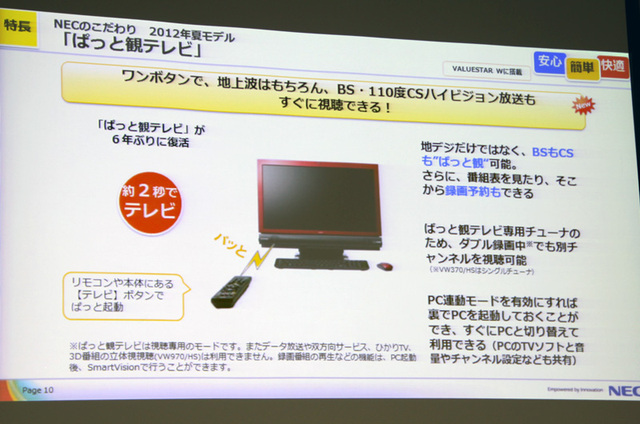 約2秒で地上/BS/110度CSデジタル放送の視聴が可能になる「ぱっと観テレビ」機能