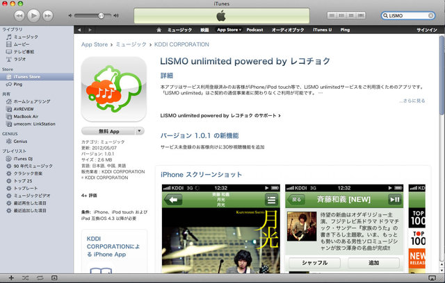 HOME > ニュース > AV&ホームシアターニュース auユーザーには2週間無料キャンペーンも KDDI、音楽配信「LISMO unlimited」のiPhone対応を正式発表 − ソフトバンク機でも利用可能 ファイル・ウェブ編集部 2012年05月11日 AppStoreの「LISMO Unlimited」アプリページ この写真の記事へ 関連リンク LISMO unlimited powered by レコチョク