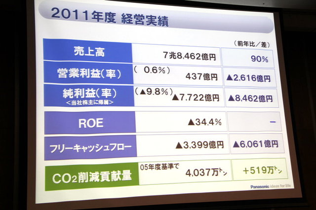 HOME > ニュース > AV&ホームシアターニュース 2012年度の事業方針も発表 パナソニック、11年度は7,722億円の赤字、今期は黒字化へ − 有機ELパネル投資は「他社と共同で」 ファイル・ウェブ編集部 2012年05月11日 前の写真へ 2011年度の経営実績 前の写真へ この写真の記事へ 関連リンク パナソニック