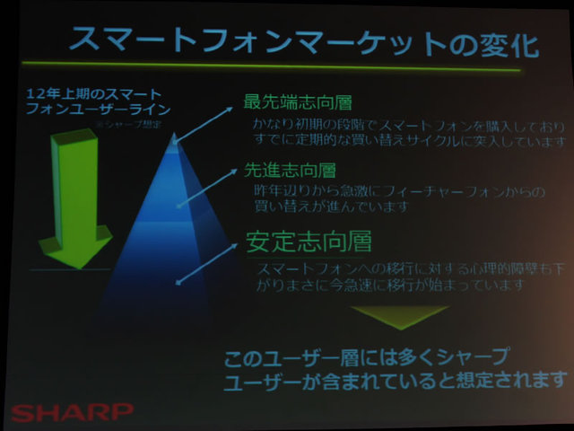 HOME > ニュース > AV&ホームシアターニュース 2012年夏モデルから順次搭載 シャープ、スマホ向け新UI「Feel UX」発表 − クラウド型健康管理サービスとの連携も ファイル・ウェブ編集部 2012年06月18日 前の写真へ 次の写真へ 安定志向のユーザー層にもスマホ乗り換えの波がきていると分析 前の写真へ 次の写真へ この写真の記事へ 関連リンク 「Feel UX」の詳細 「gooからだログ」連携の詳細