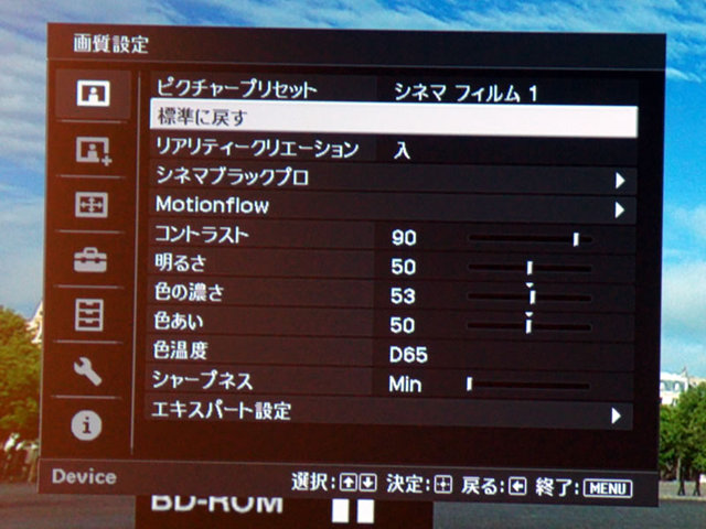 画質調整メニュー画面