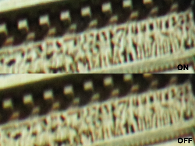 超解像のオン/オフ比較。輪郭部分などがよりハッキリと認識できる