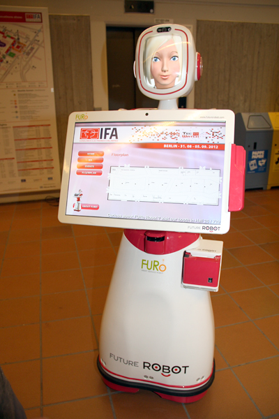 案内ロボット「FURO」。TechWatchゾーンのあるHall 11前でフロアの説明をしていた