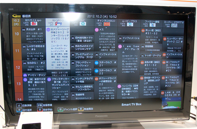 HOME > ニュース > AV&ホームシアターニュース 4G LTEもアピール <CEATEC>KDDI、Android 4.0 STB「Smart TV Box」をデモ − スティック型「Smart TV」も参考展示 ファイル・ウェブ編集部 2012年10月02日 前の写真へ 次の写真へ EPG画面 前の写真へ 次の写真へ この写真の記事へ 関連リンク KDDI CEATEC JAPAN 2012 CEATEC JAPAN 2012 関連ニュース