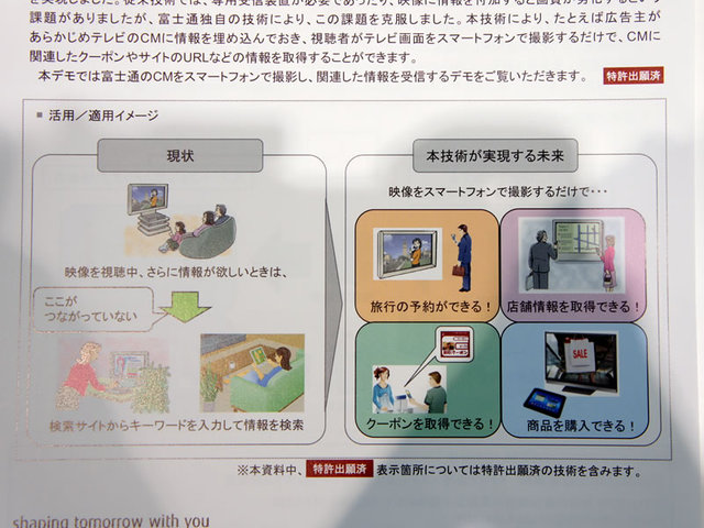 HOME > ニュース > AV&ホームシアターニュース 富士通と太陽誘電ブースをレポート <CEATEC>富士通、テレビ映像にクーポン情報などを埋め込める新技術/太陽誘電は超薄型光ディスクを披露 ファイル・ウェブ編集部 2012年10月03日 次の写真へ クーポン取得だけでなく旅行の予約なども行えるようになるという 次の写真へ この写真の記事へ 関連リンク CEATEC JAPAN 2012