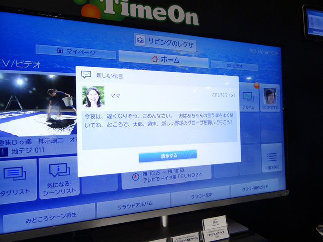 HOME > ニュース > AV&ホームシアターニュース 開発者インタビュー <CEATEC>型番の「7」に込めた特別な思い ー 東芝・本村氏/片岡氏が語る「新REGZAがスペシャルな理由」 Phile-web編集部 2012年10月02日 前の写真へ 次の写真へ 伝言ボードの機能 前の写真へ 次の写真へ この写真の記事へ 関連リンク 東芝REGZA公式サイト CEATEC JAPAN 2012