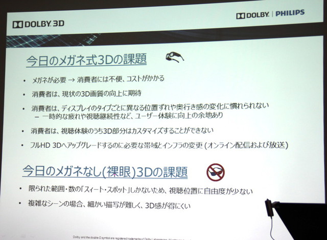 ドルビーでは、メガネ式3Dにもメガネなし3Dにも課題が多いと指摘する