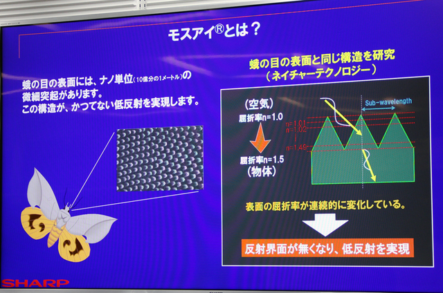 モスアイパネルの詳細。蛾の目の表面のように細かな凹凸を持たせることで外光反射を抑えつつ、コントラスト感や視野角特性などはキープするという