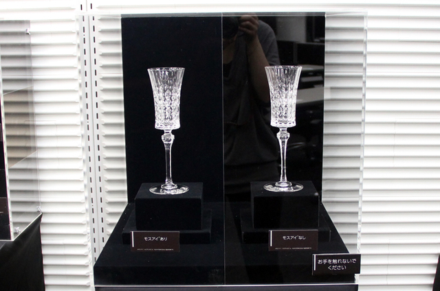 ガラスの前面にモスアイパネルを貼った面(左)と貼っていない面(右)の比較。右は映り込みがあるのに対し、左には殆どない