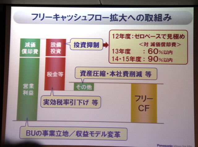 設備投資は、今年度はゼロベースで見極めを行う。13年度は減価償却費の60%以内、14-15年度は90%以内を目安にする