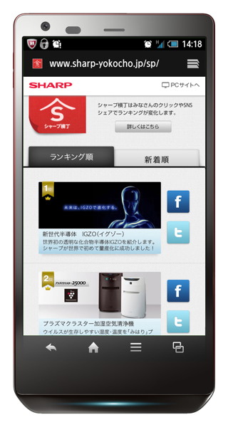 HOME > ニュース > AV&ホームシアターニュース クリックなどでランキングが変動 「シャープ横丁」スマートフォン版がオープン ファイル・ウェブ編集部 2012年11月19日 「シャープ横丁」スマートフォン版の表示イメージ この写真の記事へ 関連リンク シャープ横丁(スマートフォン版) シャープ