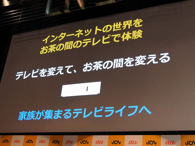HOME > ニュース > AV&ホームシアターニュース スマホ/タブレットへの番組持ち出しも可能 KDDIとJCN、Android4.0搭載STBでのサービス提供開始 − “アンドロイドマツケン”も登場 ファイル・ウェブ編集部 2012年11月28日 前の写真へ 次の写真へ お茶の間のテレビでインターネットの世界を手軽に楽しめる意義を強調 前の写真へ 次の写真へ この写真の記事へ 関連リンク JCNスマートテレビ 公式サイト アンドロイドマツケンサンバ 動画公開ページ KDDI JCN