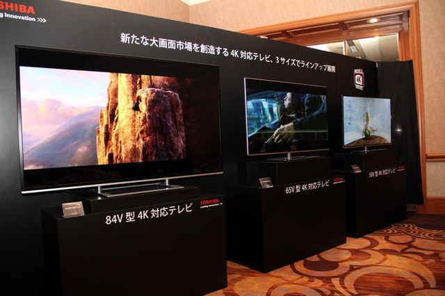 HOME > ニュース > AV&ホームシアターニュース 65/58V型は「1インチ1万円以下」 【CES】東芝、「シネマ4Kシステム」搭載の84/65/58V型テレビを上半期に発売 ファイル・ウェブ編集部 2013年01月07日 次の写真へ 左から84V型、65V型、58V型 次の写真へ この写真の記事へ 関連リンク (株)東芝 2013 International CESの記事一覧