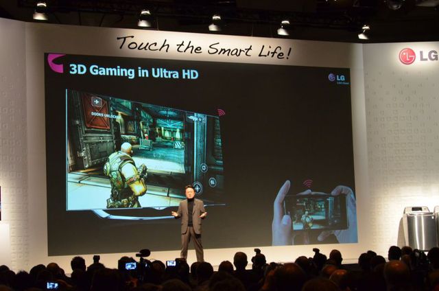 HOME > ニュース > AV&ホームシアターニュース スマートTV製品群をアグレッシブに強化 【CES】LGプレスカンファレンス − 55型有機ELを米国でも発売 − 65/55型4Kテレビも発表 一条真人 2013年01月09日 前の写真へ 次の写真へ 4Kテレビと連携したスマートフォンによるゲーミングを提案 前の写真へ 次の写真へ この写真の記事へ 関連リンク 2013 International CES 記事一覧 LGエレクトロニクス
