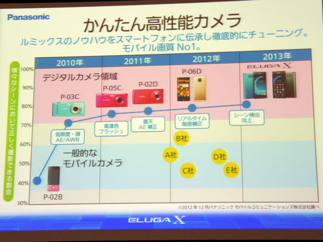 HOME > ニュース > AV&ホームシアターニュース パナソニックが説明会を開催 「もはや手のひらサイズの映画館」 − 5インチフルHDスマホ「ELUGA X」説明会が開催 ファイル・ウェブ編集部 2013年01月23日 前の写真へ 次の写真へ カメラ性能も優れているとアピール 前の写真へ 次の写真へ この写真の記事へ 関連リンク ドコモによる製品説明 パナソニック モバイルコミュニケーションズ