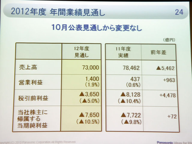 HOME > ニュース > AV&ホームシアターニュース AV事業も営業黒字化 【情報追加】パナソニック、3Q決算発表 − 純損失6,238億円も営業利益は増加 ファイル・ウェブ編集部 2013年02月01日 前の写真へ 通期見通し 前の写真へ この写真の記事へ 関連リンク パナソニック パナソニック 2012年度第3四半期 決算資料(PDF)