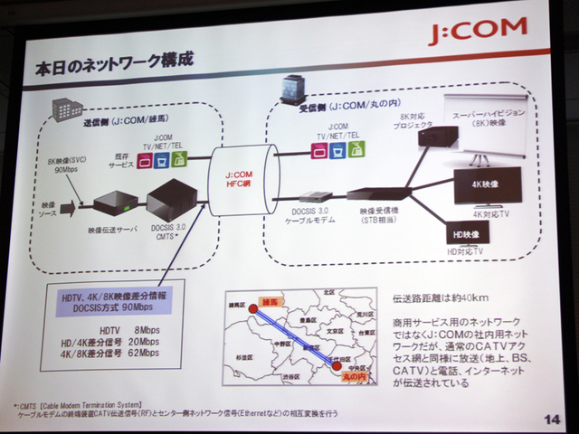 本日行われた伝送実験デモのネットワーク構成。社内用ネットワークだが、商用と同じようにネット・電話・放送のサービスも伝送されている