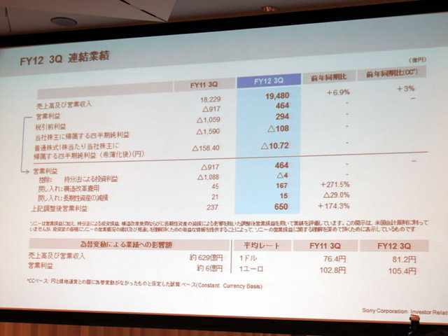 HOME > ニュース > AV&ホームシアターニュース ゲームは大幅減益 ソニー、12年度3Q業績を発表 − テレビ事業の収益改善が進む ファイル・ウェブ編集部 2013年02月07日 前の写真へ 連結業績概要 前の写真へ この写真の記事へ 関連リンク 本件の詳細(PDF) ソニー