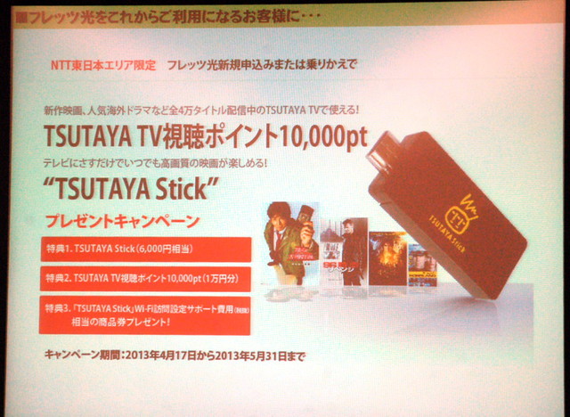 HOME > ニュース > AV&ホームシアターニュース 「TSUTAYA TV」が視聴できるスティック型端末 TSUTAYA.com、VOD端末「TSUTAYA Stick」開発 − NTT東日本と拡販・サポートで提携 ファイル・ウェブ編集部 2013年04月16日 前の写真へ 次の写真へ TSUTAYA.comのキャンペーン 前の写真へ 次の写真へ この写真の記事へ 関連リンク TSUTAYA TV NTT東日本 TSUTAYA TV キャンペーンサイト(4月17日午前9時公開予定) NTT東日本キャンペーンサイト(4月17日午前9時公開予定)