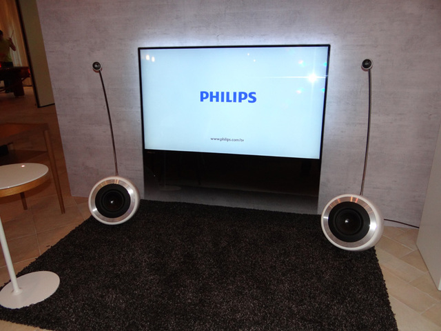 設営準備中のフィリップス。液晶テレビ「DESIGN LINE」やFidelioシリーズのスピーカーによる視聴を行う予定