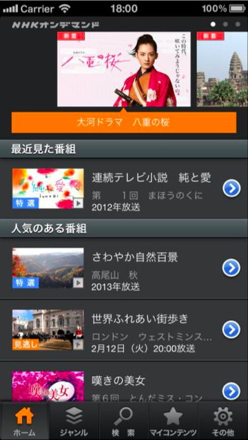 HOME > ニュース > AV&ホームシアターニュース 軽快な操作を可能に NHKオンデマンド、iPhone向け視聴アプリを提供開始 ファイル・ウェブ編集部 2013年04月24日 次の写真へ 視認性が高いレイアウトを採用 次の写真へ この写真の記事へ 関連リンク iOSアプリ「NHKオンデマンド」の詳細 NHKオンデマンド