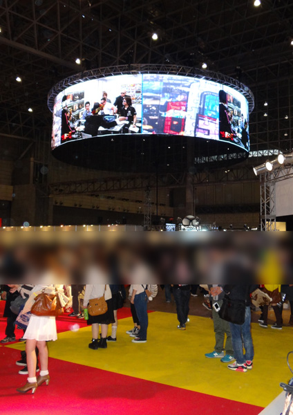 メッセ会場の中央に生放送の映像を表示する巨大なモニターを設置