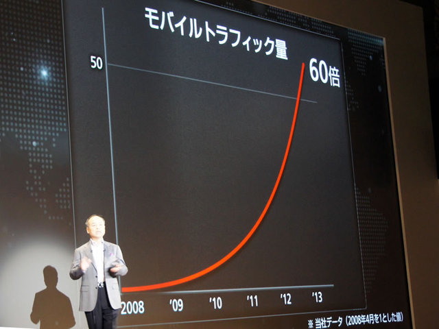 数年前に「世界で60倍になる」と予測されていたモバイルトラフィックについて、実際に同社では予測を上回る60倍のトラフィックになっている現実を紹介