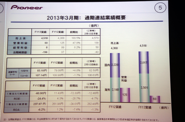 HOME > ニュース > AV&ホームシアターニュース カーエレクトロニクス事業を強化 パイオニア、ドコモ・三菱電機と資本業務提携 − 中期経営計画も発表 ファイル・ウェブ編集部 2013年05月13日 次の写真へ 2012年度通期連結業績の概況 次の写真へ この写真の記事へ 関連リンク 2012年度業績に関するニュースリリース(PDF) グループ組織改編に関するニュースリリース(PDF) 中期経営計画に関するニュースリリース(PDF) 三菱電機との資本・業務提携に関するニュースリリース(PDF) NTTドコモとの資本・業務提携に関するニュースリリース(PDF) パイオニア