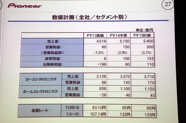 HOME > ニュース > AV&ホームシアターニュース カーエレクトロニクス事業を強化 パイオニア、ドコモ・三菱電機と資本業務提携 − 中期経営計画も発表 ファイル・ウェブ編集部 2013年05月13日 前の写真へ 次の写真へ 2カ年の中期事業計画を発表した 前の写真へ 次の写真へ この写真の記事へ 関連リンク 2012年度業績に関するニュースリリース(PDF) グループ組織改編に関するニュースリリース(PDF) 中期経営計画に関するニュースリリース(PDF) 三菱電機との資本・業務提携に関するニュースリリース(PDF) NTTドコモとの資本・業務提携に関するニュースリリース(PDF) パイオニア