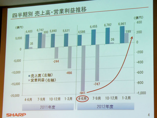 HOME > ニュース > AV&ホームシアターニュース シャープ、'12年度は純損失5,453億円 − 「新生シャープ」目指す中期経営計画発表 ファイル・ウェブ編集部 2013年05月14日 前の写真へ 次の写真へ 四半期別の売上高と営業利益の推移 前の写真へ 次の写真へ この写真の記事へ 関連リンク シャープのIR情報