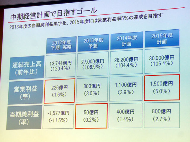 HOME > ニュース > AV&ホームシアターニュース シャープ、'12年度は純損失5,453億円 − 「新生シャープ」目指す中期経営計画発表 ファイル・ウェブ編集部 2013年05月14日 前の写真へ 次の写真へ 売上高・営業利益・純利益の計画 前の写真へ 次の写真へ この写真の記事へ 関連リンク シャープのIR情報