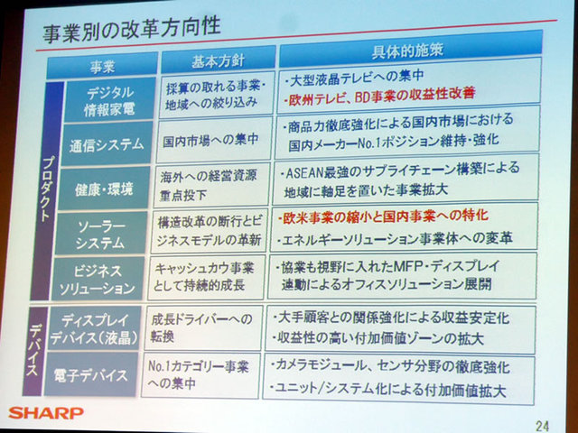 HOME > ニュース > AV&ホームシアターニュース シャープ、'12年度は純損失5,453億円 − 「新生シャープ」目指す中期経営計画発表 ファイル・ウェブ編集部 2013年05月14日 前の写真へ 次の写真へ テレビ事業は大型化へ注力 前の写真へ 次の写真へ この写真の記事へ 関連リンク シャープのIR情報