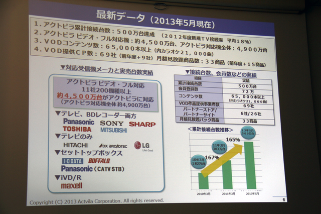 2013年5月現在、アクトビラの累計接続台数は500万台を突破。