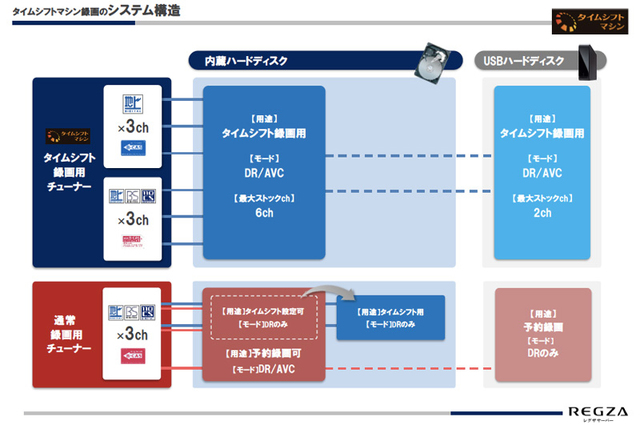 DBR-M490のタイムシフトマシン録画のシステム構成。後述する通常録画用チューナーを使ったタイムシフトマシン録画など機能を多数進化させている