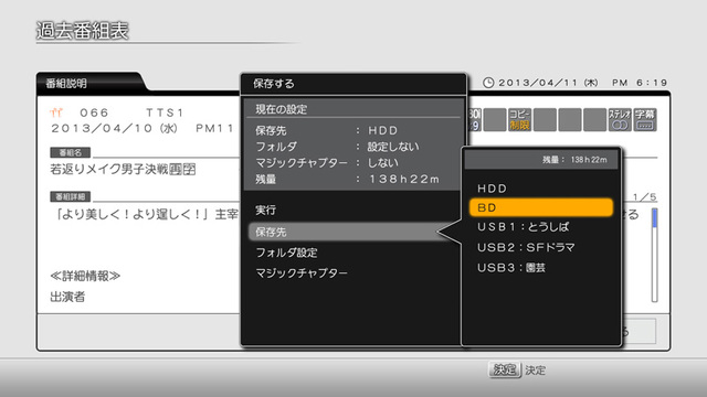 過去番組表からのダビング指定。内蔵HDDのほか、BDへの直接ダビングが可能になった