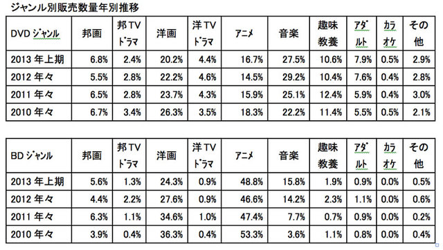 HOME > ニュース > AV&ホームシアターニュース BD/DVD等の映像ソフト売上動向レポート 2013年上半期BD売上トップは「ヱヴァ:Q」 − サウンドスキャンが発表 ファイル・ウェブ編集部 2013年08月13日 前の写真へ 年度別のジャンル構成推移 前の写真へ この写真の記事へ 関連リンク サウンドスキャンジャパン ファイル・ウェブ「週間 BDソフト TOP20」 ファイル・ウェブ「週間 DVDソフト TOP20」