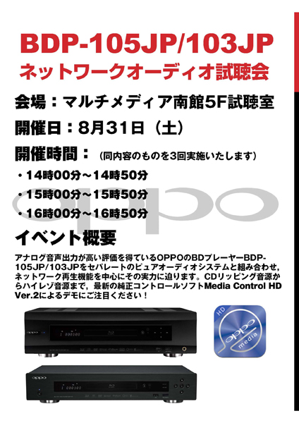 HOME > ニュース > AV&ホームシアターニュース 8月31日にヨドバシ新宿西口本店で OPPO、「BDP-105JP/103JP」のネットオーディオ試聴会 ファイル・ウェブ編集部 2013年08月21日 この写真の記事へ 関連リンク イベントの詳細 OPPO Digital Japan