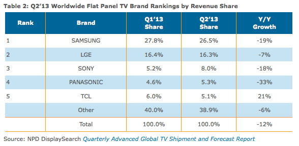 '13年2Qの薄型テレビ世界シェア、中国メーカーが台頭 − ディスプレイサーチ発表