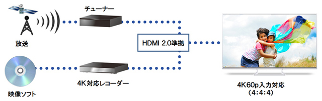HDMIの最新規格である「HDMI2.0」に準拠し、4K/60p映像信号の入力に対応。色信号を圧縮しない「4:4:4」入力も可能となった
