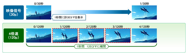4K/60p入力に対応しているので、4K/120pでの表示についても、4K30p入力より補間するコマ数が少なくてすむ