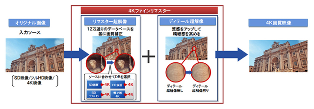 「4Kファインリマスターエンジン」は、「リマスター超解像」と「ディテール超解像」の組み合わせによりフルHDやSD映像を4K映像にアップコンバートする