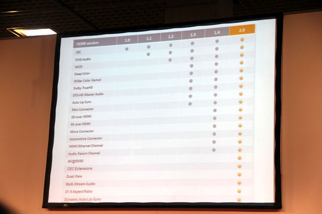 HOME > ニュース > AV&ホームシアターニュース 4K/60p入力や21対9映像、32ch音声に対応 <IFA>「HDMI 2.0」プレスカンファレンス開催、新機能の詳細を説明 ファイル・ウェブ編集部 2013年09月07日 前の写真へ 次の写真へ これまでのHDMI規格とバージョン2.0の機能比較 前の写真へ 次の写真へ この写真の記事へ 関連リンク Phile-webニュース【「HDMI 2.0」発表 − 4K/60p対応、32ch音声をサポート】 HDMI 公式サイト HDMI 2.0のニュースリリース(英文) HDMI 2.0の詳細(英文)