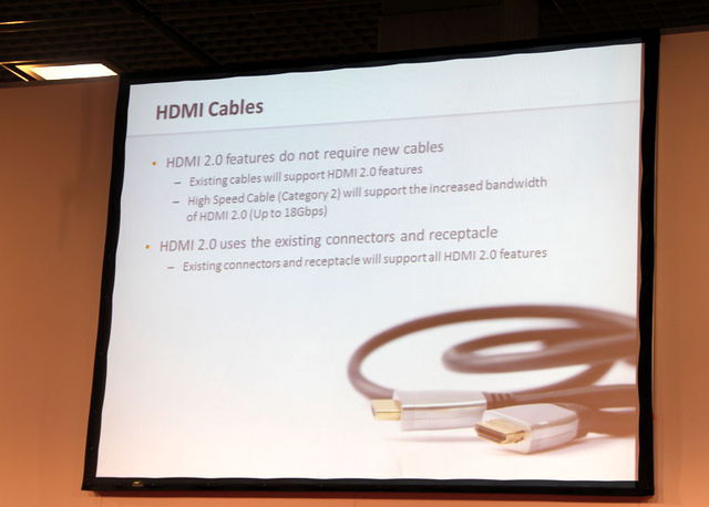 HOME > ニュース > AV&ホームシアターニュース 4K/60p入力や21対9映像、32ch音声に対応 <IFA>「HDMI 2.0」プレスカンファレンス開催、新機能の詳細を説明 ファイル・ウェブ編集部 2013年09月07日 前の写真へ 次の写真へ 伝送はこれまでのHDMI 1.4b対応ケーブルで行うことが可能だ 前の写真へ 次の写真へ この写真の記事へ 関連リンク Phile-webニュース【「HDMI 2.0」発表 − 4K/60p対応、32ch音声をサポート】 HDMI 公式サイト HDMI 2.0のニュースリリース(英文) HDMI 2.0の詳細(英文)