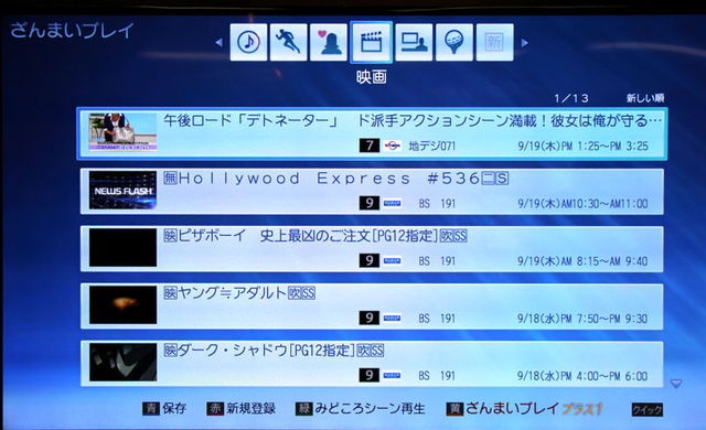 「ざんまいプレイ」のコンテンツリスト画面では、通常のタイムシフトマシンとタイムシフトプラス1の録画番組が混在して表示される