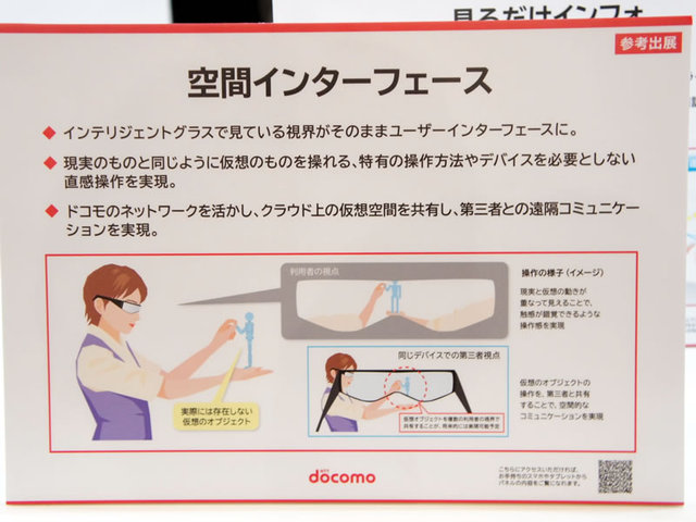 HOME > ニュース > AV&ホームシアターニュース 「インテリジェントグラス」の参考展示なども <CEATEC>ドコモ、Xperia Z1/GALAXY Note 3の投入発表 − 「ドラクエ」スマホも ファイル・ウェブ編集部 2013年09月30日 前の写真へ 「空間インターフェース」のイメージ 前の写真へ この写真の記事へ 関連リンク CEATEC JAPAN 2013 ドコモ