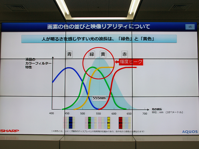 人間が明るさを感じやすい緑と黄色の波長を有することで、2つの輝度ピークを実現する