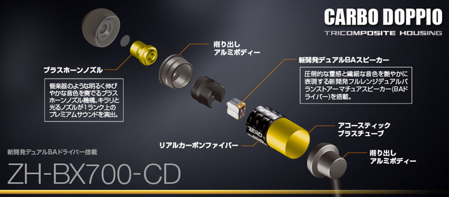 HOME > ニュース > AV&ホームシアターニュース “CARBO”シリーズ第二弾 ZERO AUDIO、3重制振構造のBAイヤホン上位機「ZH-BX700-CD/ZH-BX510-CS」 ファイル・ウェブ編集部 2013年10月23日 前の写真へ 次の写真へ ZH-BX700-CDの内部構造 前の写真へ 次の写真へ この写真の記事へ 関連リンク 「ZH-BX700-CD」の詳細 「ZH-BX510-CS」の詳細 ZERO AUDIO