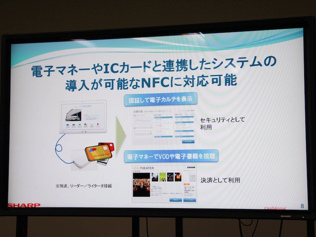 HOME > ニュース > AV&ホームシアターニュース 病院、ホテル、フィットネス施設への導入を提案 シャープ、「ITテレビモニター」の説明会を開催 ファイル・ウェブ編集部 2013年10月24日 前の写真へ 次の写真へ NFC対応で電子マネーやICカードと連携したシステムの導入も可能 前の写真へ 次の写真へ この写真の記事へ 関連リンク シャープ(株) 本製品のニュースリリース