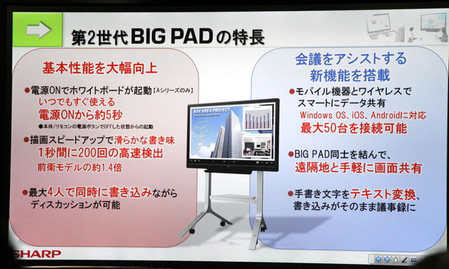 HOME > ニュース > AV&ホームシアターニュース オフィス/文教向け シャープ、15.6型のIGZO搭載Winタブレットや電子ホワイトボードを発表 ファイル・ウェブ編集部 2014年01月16日 前の写真へ 次の写真へ 第2世代BIG PADの特徴 前の写真へ 次の写真へ この写真の記事へ 関連リンク タッチディスプレイ「BIG PAD」のニュースリリース タブレット「RW-16G1のニュースリリース
